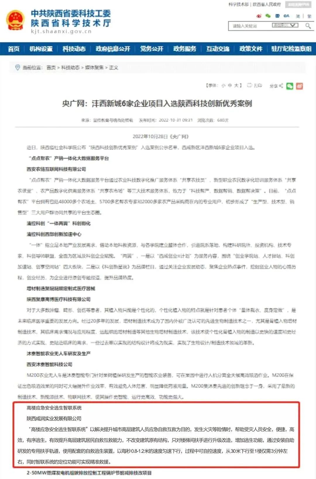 我司自主研發(fā)的專利型科技項(xiàng)目“高樓應(yīng)急安全逃生智聯(lián)系統(tǒng)”作為“創(chuàng)新賦能高效治理高品質(zhì)生活”板塊成功入選2022年陜西科技創(chuàng)新優(yōu)秀案例。據(jù)了解,灃西新城共有6家企業(yè)項(xiàng)目入選。