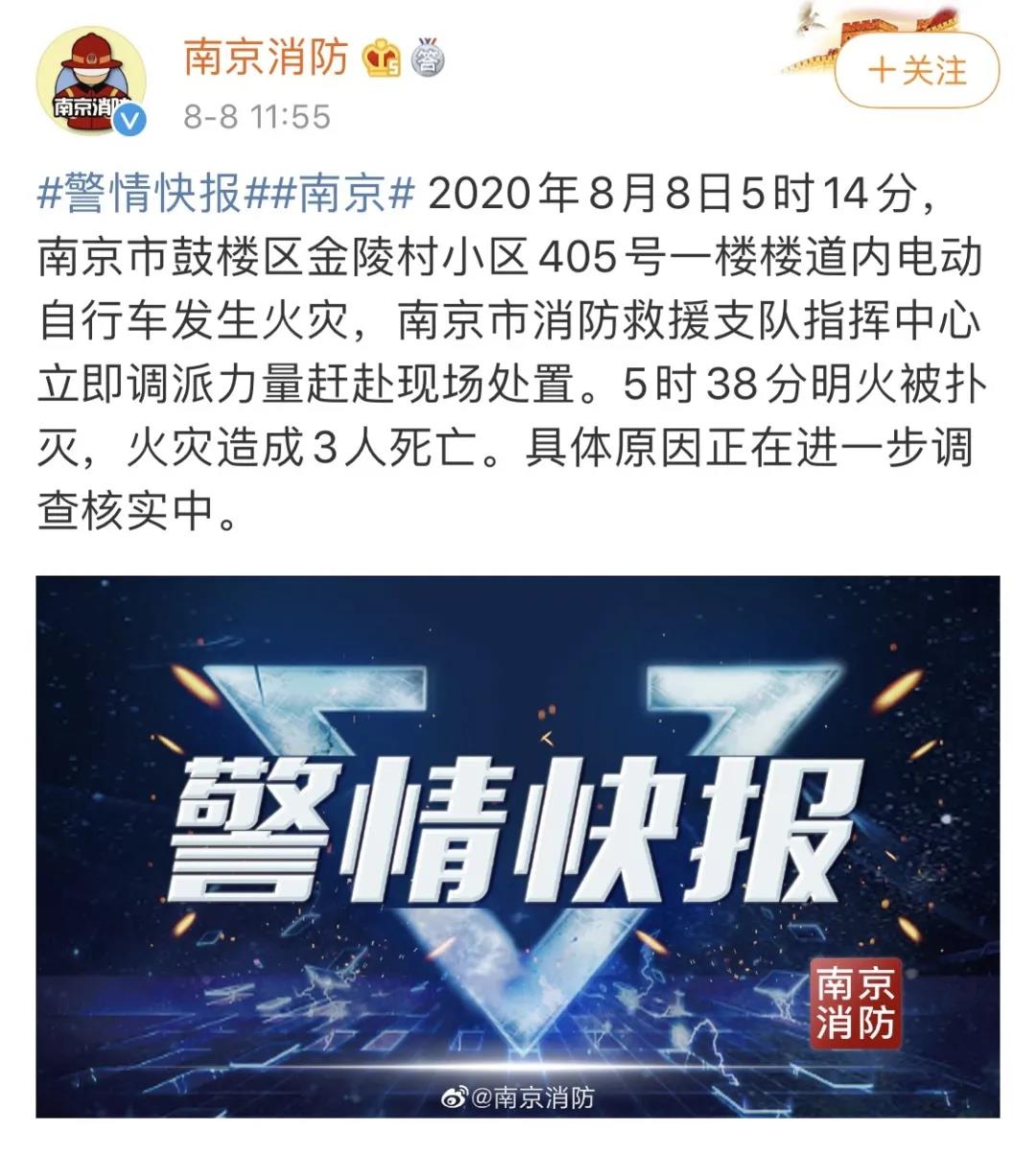 8月8日5時14分,南京市鼓樓區(qū)一小區(qū)樓道內(nèi)電動自行車起火,火災(zāi)造成3人不幸死亡,最小的只有11歲。據(jù)了解,該建筑為6層磚混結(jié)構(gòu),起火部位為該樓一樓樓道。電動車失火后引燃樓道內(nèi)裸露電線等雜物,在樓內(nèi)產(chǎn)生大量煙霧。