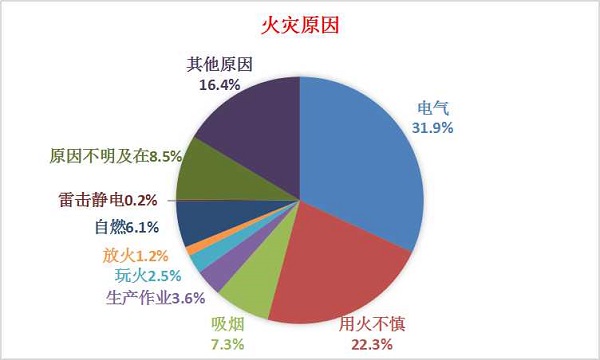 從火災(zāi)調(diào)查情況看,因電氣引發(fā)的占31.9%,尤其是57.8%的較大火災(zāi)也系電氣引起;其次,因用火不慎引發(fā)的占22.3%;其余原因中,吸煙占7.3%、生產(chǎn)作業(yè)占3.6%、玩火占2.5%,放火占1.2%、自燃占6.1%,雷擊靜電占0.2%,原因不明及在查的占8.5%,其他原因占16.4%。