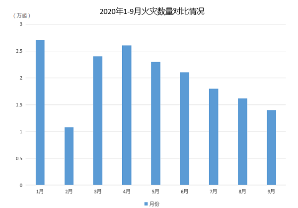 春節(jié)前后火災(zāi)風(fēng)險(xiǎn)大,1月份發(fā)生火災(zāi)2.7萬起,是今年火災(zāi)最多的月份;受疫情影響,經(jīng)濟(jì)社會活動停滯,誘發(fā)火災(zāi)因素減少,2月份火災(zāi)環(huán)比下降40%;3月份后,各地陸續(xù)復(fù)工復(fù)產(chǎn),且受春季風(fēng)干物燥等季節(jié)因素影響,3月、4月火災(zāi)分別達(dá)到2.4萬起、2.6萬起,5月份后火災(zāi)逐月下降,9月份為1.4萬起。