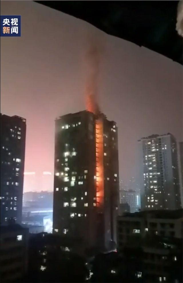 現(xiàn)場畫面顯示,火勢異常兇猛,明火很快貫穿著火點以上樓層,高樓瞬間變成了一個“煙囪”,不斷還有小火星從頂樓往下掉,看起來觸目驚心。初步了解,起火原因是中間樓層的雨棚著火引發(fā)火災,具體情況正在進一步的調(diào)查中。